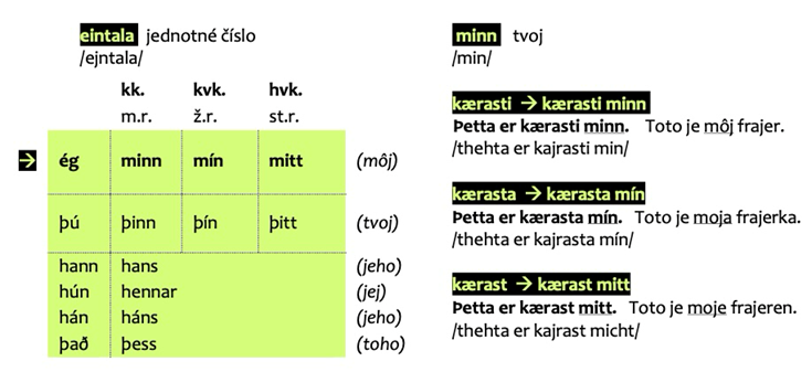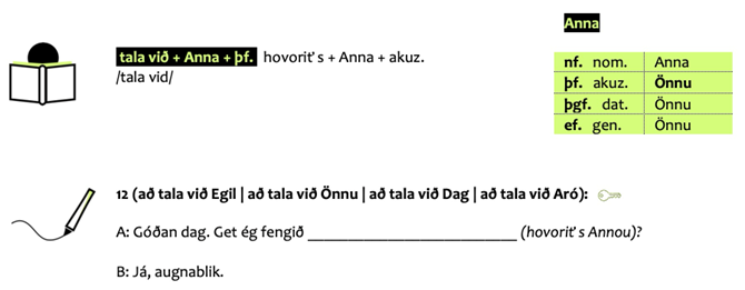 Celá slovná zásoba v knihe je preložená z islandčiny do materinského jazyka učiacich sa, teda v tomto prípade do slovenčiny. Táto metóda uľahčuje porozumenie jednotlivým slovám v kontexte bez potreby ich dodatočného vyhľadávania v slovníku. Gramatika sa vyučuje nepriamo, to znamená, že sa dá vydedukovať z rozhovorov a cvičení alebo nájsť v prehľadových tabuľkách. Všetky štyri pády v islandčine, t. j. nominatív, akuzatív, datív a genitív, sa taktiež vyučujú nepriamo jednak v konverzačných dialógoch, ako aj v doplnkových cvičeniach. Napríklad správny tvar skloňovania vlastného podstatného mena Anna v akuzatíve je vytlačený nahrubo v prehľadovej tabuľke. Možno ešte dodať, že pádový systém skloňovania podstatných mien v slovenčine je podobný tomu v islandčine, no slovenčina má šesť pádov a islandčina len štyri.