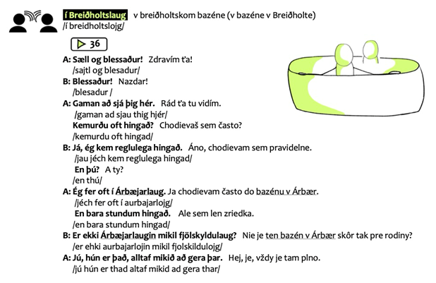 Niekoľko príkladov z islandského každodenného života možno nájsť či už v konverzačných cvičeniach alebo v textoch piesní islandských hudobníkov či dokonca vidieť i na samotných obrázkoch. Uvedený príklad znázorňuje rozhovor medzi kamarátmi vo vírivke, ktorý ponúka pohľad do islandskej kultúry kúpania v miestnych kúpeľoch.