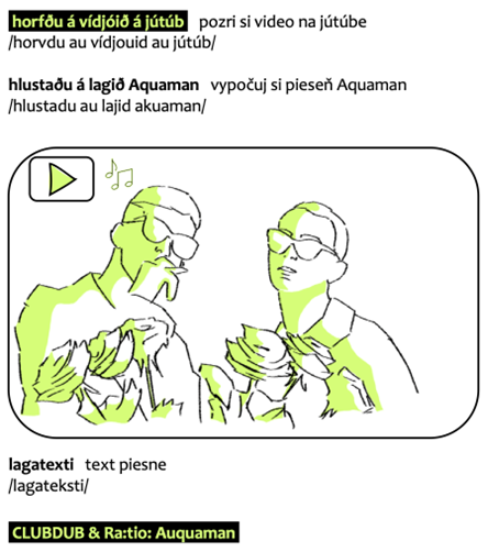 V učebnici sú uvedené príklady dvoch piesní od známych islandských hudobníkov. Prvá pieseň sa nazýva Aquaman od Clubdub & Ra:tio a tá druhá je Vísur Vatnsenda-Rósu v podaní Björk. Texty oboch piesní sú preložené do slovenčiny a tú prvú sprevádzajú aj ilustrácie na uľahčenie porozumenia textu. Obe piesne je možné si vypočuť na YouTube.