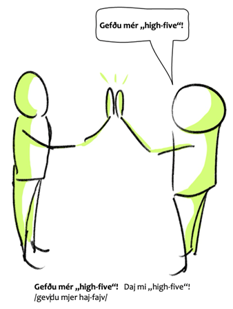 Každá strana v učebnici predstavuje samostatnú kapitolu, čo umožňuje učiacim sa sústrediť sa na konkrétny obsah bez toho, aby si museli prečítať predchádzajúce kapitoly. Tento učebný prístup je reakciou na skracujúcu sa dobu pozornosti u mládeže, ktorá sa často spája s rýchlosťou toku informácií na sociálnych sieťach a následne aj so zrýchľujúcim sa životným štýlom v našej spoločnosti. Taktiež sú v učebnici uvedené rôzne ustálené slovné spojenia, ktoré sa často spájajú s angličtinou, a tak sú ľahko rozpoznateľné a dajú sa možno aj preto ľahšie zapamätať. Ako príklad je uvedený krátky rozhovor medzi dvoma priateľmi: Gefðu mér „high-five“! Daj mi „high-five“!