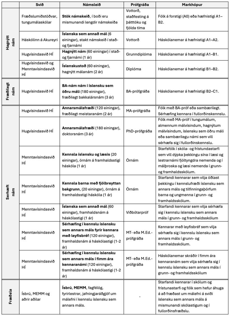 Vegna breytinga í samfélaginu fjölgar þeim sem þurfa á kennslu íslensku sem annars máls að halda. Þessi þróun kallar einnig á aukin námstækifæri fyrir framtíðakennara og þá sem þegar starfa í skólum landsins og eru með sérhæfingu í kennslu íslensku sem annars máls. Hér á eftir verður gerð grein fyrir mismunandi námstækifærum á þessu sviði og í kjölfarið gefin heildaryfirsýn yfir hagnýtt málanám í íslensku sem öðru máli og sérhæft kennaranám sem er í boði.